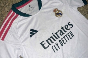 Opaleak曬出2026-2027賽季皇馬主場球衣諜照,該款球衣由阿迪達斯設計,主色調延續經典的白色,肩部三道杠為粉紅色,領口為圓領設計,與袖口都帶有深綠色鑲邊。