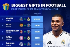 體育資訊12月26日訊 德國轉會市場統計了足壇歷史免簽球員的身價,并列出榜單,姆巴佩1.8億歐居首,梅西8000萬歐次席。