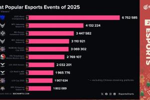 體育資訊12月26日訊?Esports Charts統計2025年最受歡迎的電競賽事前十名:(觀賽峰值)