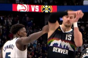GIF-約基奇準備罰球,華子伸手扒拉一下,約基奇抱怨,華子說那咋了?裁判這里沒吹罰。
