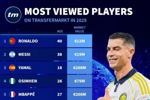 體育資訊12月26日訊 德國轉會市場統(tǒng)計了2025年球員信息頁面的瀏覽量,并列出排名,C羅、梅西、亞馬爾前三。