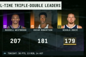 這樣一來,他職業生涯的三雙總數來到179次,距離歷史第二多的“大O”奧斯卡·羅伯特森只差兩場,距離歷史第一的威少還差28場。