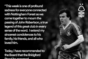 體育資訊12月27日訊 諾丁漢森林傳奇球星約翰·羅伯遜去世,他曾幫助球隊(duì)兩次奪得冠軍杯(歐冠前身)。對(duì)于這樣一名在俱樂部歷史上舉足輕重的人物,諾丁漢森林老板馬里納基斯提出了一個(gè)緬懷約翰·羅伯遜的方案。