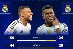 體育資訊12月27日訊 德國轉會市場統計了姆巴佩上賽季、本賽季的數據,并做出對比。