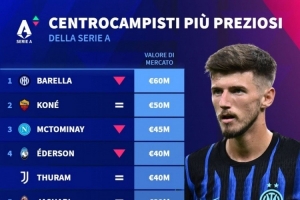 體育資訊12月27日訊 德國轉會市場統計了意甲中場中路球員的身價,并列出榜單,巴雷拉6000萬歐居首。
