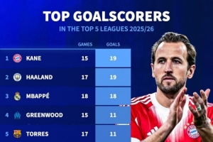 體育資訊12月27日訊 德國轉會市場列出了本賽季五大聯賽射手榜,凱恩、哈蘭德19球居首。