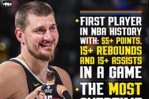 本場比賽,約基奇通過自己得分和助攻,合計(jì)為掘金貢獻(xiàn)了96分,歷史第三高。