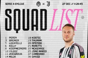 體育資訊12月27日訊 北京時間明天凌晨,尤文將在意甲第17輪比賽中客場對陣比薩,尤文公布了此役的球員名單。孔塞桑、卡巴爾、魯加尼、弗拉霍維奇缺席。