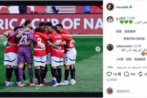 薩拉赫更新社媒動態,曬出埃及球員們在球場上搭肩擁抱、圍成一圈的照片,慶祝球隊晉級淘汰賽。