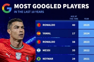 體育資訊12月27日訊 《轉會市場》根據谷歌搜索列出了近10年的年度被搜索次數最多的足球運動員,C羅共計6次登頂。