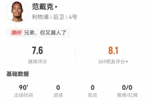 體育資訊12月28日訊 利物浦在本輪英超對陣狼隊,范戴克本場數據如下: