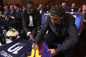 兩人在今年分獲金球獎前二,他們也在頒獎期間相互贈送了簽名球衣,不遠(yuǎn)處則是拉波爾塔、維蒂尼亞、伊涅斯塔等兩隊(duì)的知名人士。
