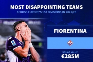 體育資訊11月7日訊 德國(guó)轉(zhuǎn)會(huì)市場(chǎng)根據(jù)球隊(duì)的身價(jià)和目前的排名,列出了本賽季歐洲頂級(jí)聯(lián)賽最令人失望球隊(duì),佛羅倫薩、紐卡、畢爾巴鄂競(jìng)技在列。