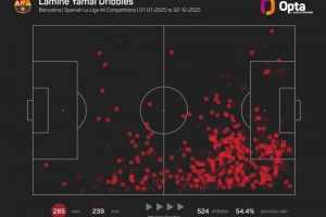 18歲的巴薩右邊鋒亞馬爾在今年各項賽事共計524次嘗試過人,285次成功過人是為五大聯賽球員同期最多。