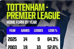 熱刺此前只在1994年、2003年主場輸球場次達到10場,而今年他們還有4場英超主場比賽。
