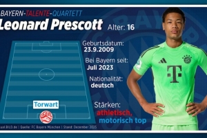 16歲門將萊昂納德·普雷斯科特身高已達1.96米,比諾伊爾還高兩厘米。他出生于紐約,但在柏林長大。2023年7月,他從柏林聯合轉會至拜仁,并憑借出色表現迅速接近一線隊。這位年輕的門將已經開始與一線隊的門將教練邁克爾·雷納(45歲)和安德烈亞斯·羅塞爾(37歲)一起訓練。