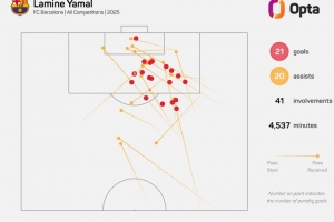 Opta指出,五大聯賽球員之中,僅亞馬爾、奧利塞2025年各賽事進球20+且助攻20+,其中亞馬爾21球20助,奧利塞21球24助。