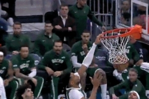 GIF-字母哥轉身扛開小橋,左手單臂虐筐