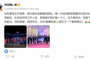 林詩棟在個(gè)人微博寫道:站在賽場從不孤單,因?yàn)樯砗笥凶钣驳膱F(tuán)隊(duì)。每一次擊球都承載著你們的付出。感恩教練、隊(duì)友和所有工作人員,榮譽(yù)屬于我們每一個(gè)人。這不是終點(diǎn),而是下一程的起點(diǎn)。保持渴望,保持專注,2025賽事收官,我們下一個(gè)賽場再見!