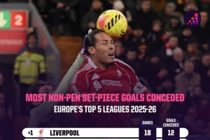 本賽季五大聯賽定位球失球榜(非點球):