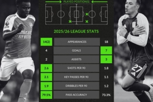 體育資訊12月31日訊 英超賽季上半程最后一輪比賽,阿森納將和維拉交手。本場比賽之前,WhoScored對兩隊進攻核心薩卡及摩根·羅杰斯的數據進行了對比。