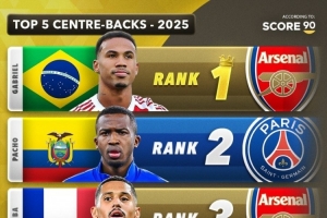 以下是2025年最佳中后衛前五榜單: