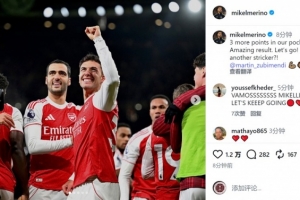 阿森納中場梅里諾社媒曬出與進球功臣蘇維門迪一起慶祝的照片,配文:“我們又收獲3分!很棒的結果,繼續加油!”