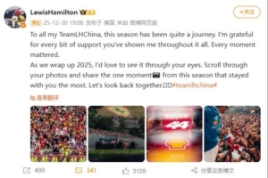 漢密爾頓微博寫道:致我所有的中國車迷,這個賽季是一段不平凡的旅程。感謝你們一直以來對我的支持,每一刻都意義非凡。隨著2025年的結束,我想通過你們的視角來回顧這一年。翻閱你們的照片,分享本賽季最讓你難忘的一刻??。讓我們一起回味這段時光。