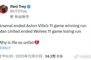 曼聯球迷:阿森納終結了維拉的11連勝,曼聯終結了狼隊的11連敗,為什么生活這么不公平!??