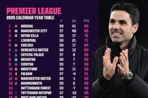 體育資訊12月31日訊 2025年英超聯賽已經落下帷幕,以下是2025年全年度的英超積分排行榜以及凈勝球情況。