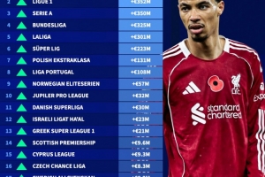 體育資訊12月31日訊 德轉統計了2025年歐洲聯賽整體的身價上漲和跌幅排行榜,英超斷層領先排名榜首。