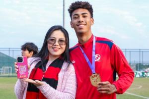 體育資訊12月31日訊 恒大足球學校全勝奪得U17精英聯賽冠軍,賽后張洪福的媽媽與兒子合影慶祝。