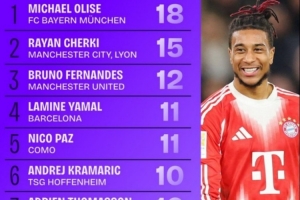 體育資訊12月31日訊 數據網站Squawka盤點了2025年五大聯賽助攻榜,其中拜仁球員奧利塞居首,具體如下: