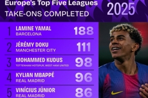 體育資訊12月31日訊 2025年即將結束,squawka也統計了本年度成功過人情況,亞馬爾斷崖領跑。