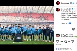 樸志洙在社媒曬出此前領(lǐng)取百場(chǎng)紀(jì)念球衣的照片,并配文寫道:“今天,我要向熱愛(ài)武漢三鎮(zhèn)的各位道別。三鎮(zhèn)將永遠(yuǎn)在我心中有著特殊的位置。謝謝。”