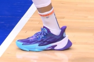 本場比賽,庫里賽前熱身環節,穿回了UA,上腳了庫里品牌的旗艦鞋款Curry Series 7。