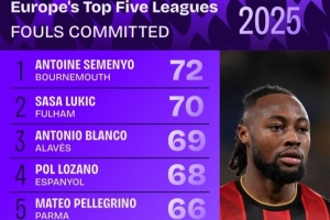 體育資訊1月1日訊 Squawka統計2025年五大聯賽球員犯規次數榜,塞梅尼奧72次居首。