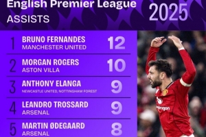 體育資訊1月1日訊 Squawka統計2025年英超球員助攻次數榜,B費12次居首,摩根·羅杰斯10次第二。
