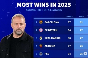 體育資訊1月1日訊 2025年已經結束,《轉會市場》也統計了本年度五大聯賽勝場最多情況,巴薩獨自居首。