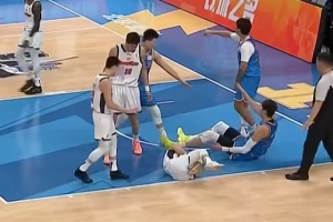 周琦被撞飛后倒地誤傷徐杰膝蓋!后者頭蓋毛巾已被隊友背下場!