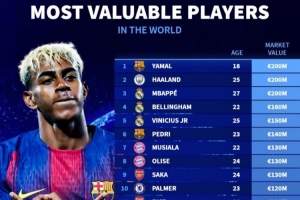 體育資訊1月1日訊 2025年已經結束,《轉會市場》也列出了當前全球身價榜前二十的球員,亞馬爾、哈蘭德和姆巴佩均2億歐最高。