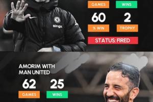 阿莫林執教曼聯:62場25勝,勝率40%,0座冠軍,安全
