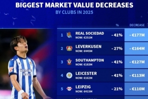 體育資訊1月2日訊 2025年已經(jīng)結(jié)束,《轉(zhuǎn)會市場》也統(tǒng)計了年度球隊身價貶值榜,皇社、藥廠分列前二。