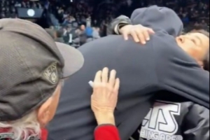 賽前,杜蘭特與籃網死忠老球迷Mr Whammy親切交流,并擁抱了蔡老板夫人吳明華。