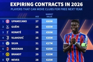 體育資訊1月2日訊 2026年已經到來,多位知名球員將在今夏合同到期,《轉會市場》也統計了今夏合同到期球員的最貴身價榜,三大中衛包攬前三。