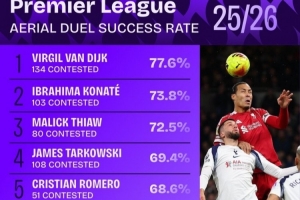 體育資訊1月3日訊 數據機構squawka統計了本賽季英超爭頂成功率情況,利物浦雙中衛包攬前二。