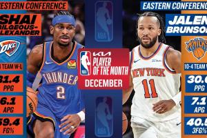 體育資訊01月03日訊 NBA官方宣布,尼克斯布倫森與雷霆亞歷山大分別當選12月東西部月最佳球員。