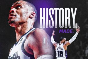 比賽第四節(jié),國(guó)王后衛(wèi)拉塞爾·威斯布魯克突破上籃得手,得到本場(chǎng)比賽第17分,個(gè)人生涯總得分來(lái)到26711,超越奧斯卡·羅伯特森(26710)升至NBA歷史得分排行榜第15位,成為NBA歷史控衛(wèi)得分王!