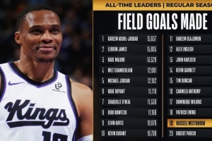 本場比賽過后,威少運動戰進球數9615個,超越帕里什升至歷史第19位,排在他前面的是尤因的9702次。