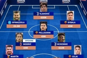 前鋒:斯皮納佐拉(那不勒斯,3500萬(wàn)歐元)、弗拉霍維奇(尤文圖斯,3500萬(wàn)歐元)、迪巴拉(500萬(wàn)歐元)